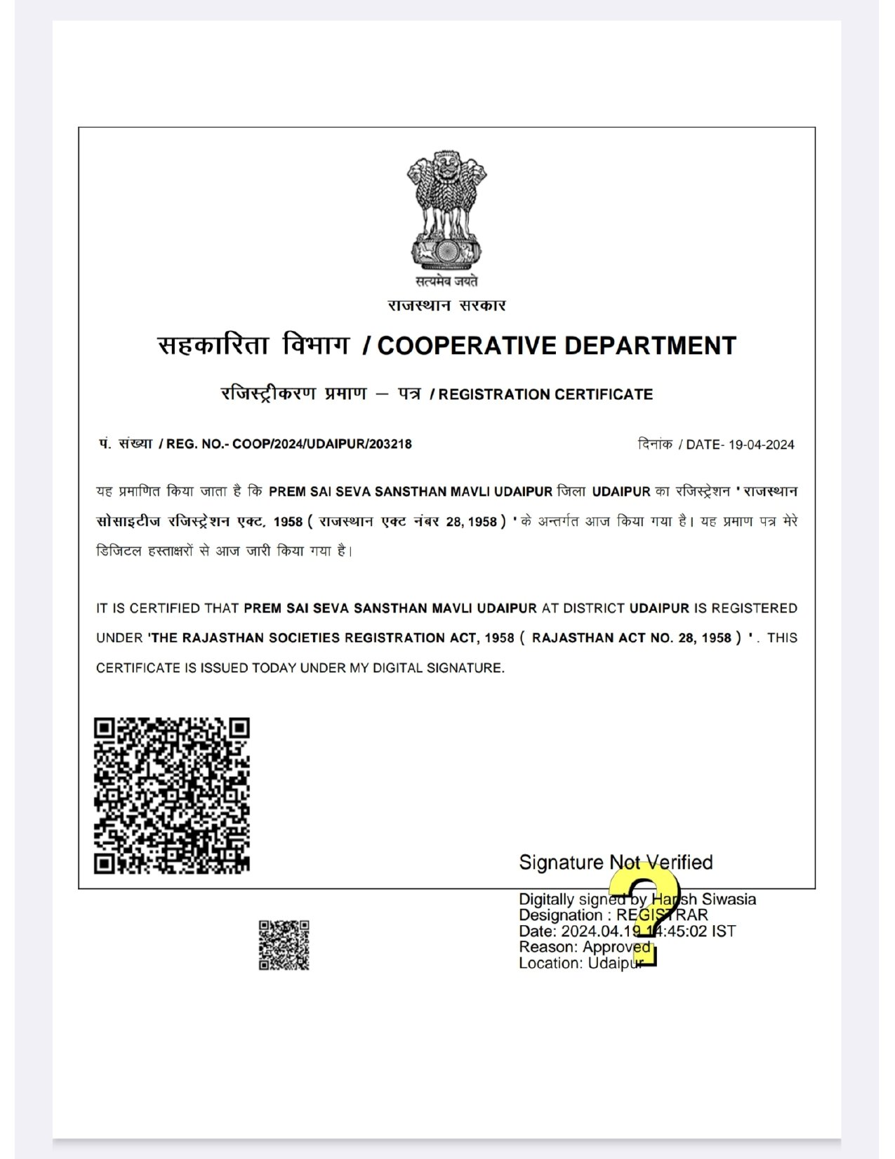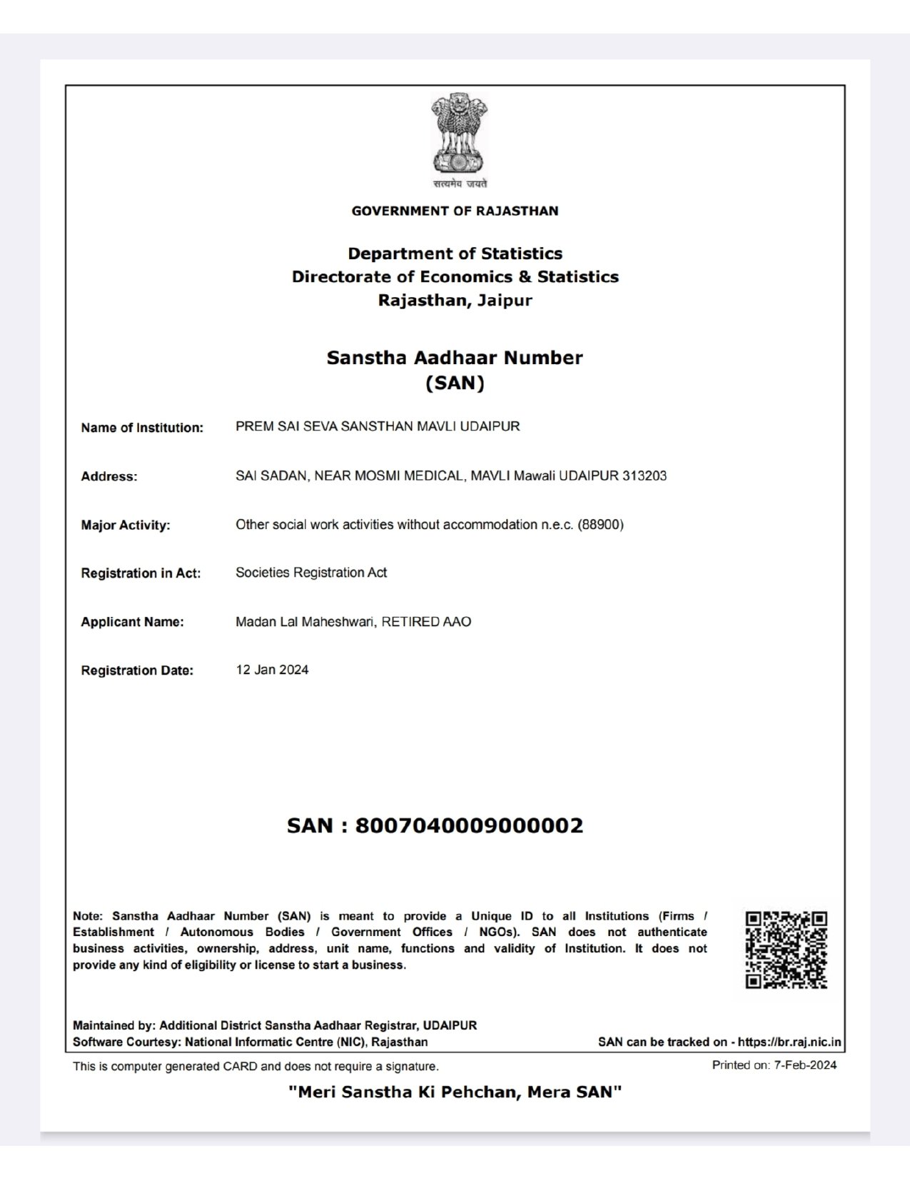 खाताधारक नाम (Account Name): PREM SAI SEVA SANSTHAN MAVLI UDAIPUR